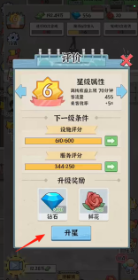 3、在【评价】界面,满足“设施,服务评分”(610/600、344/250),点击【升星】(红箭头),拿钻石、鲜花奖励,解锁离线收益,客流加成。
