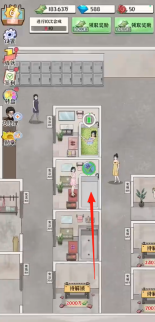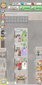 1进入宿舍界面后,点击带有绿色图标的房间(红箭头指示),检查租客的状态,并收集收益(包括金币和钻石)。