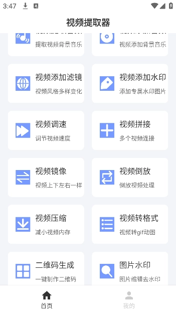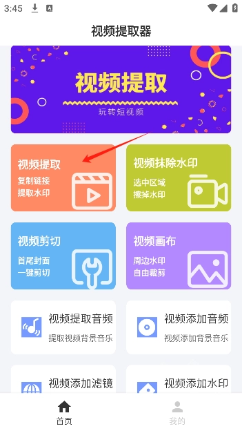 1、下载并启动视频提取器app,在主界面选择视频提取功能