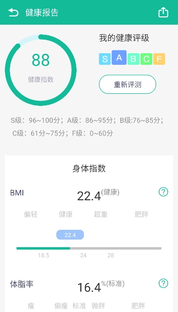 - 健康评价自动判断状态,结合运动和身体数据输出结果。