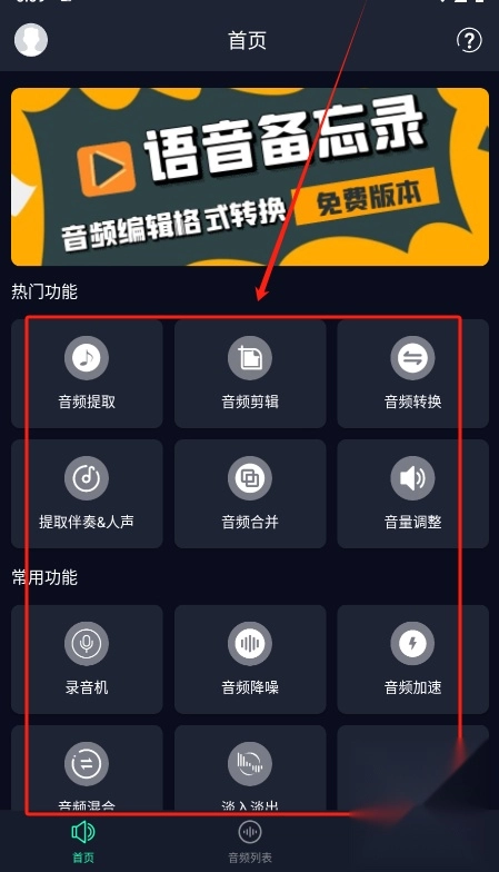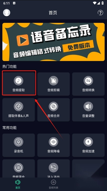 2. 首页显示功能选项,包括音频提取、剪辑、转换和合并。点击所需功能开始操作。