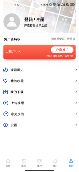 4、登录我的个人中心页面后,您可以开始行星视频之旅,在这里可以查看观看记录、我的收藏、本地视频、上传视频、提交反馈意见等,并且还能进行个性化设置。