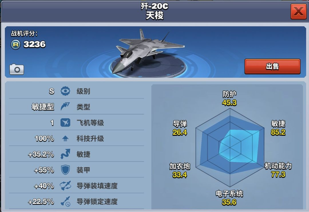 歼-20C 天梭在游戏中是一架S级的敏捷型飞机,特点是装填快,激斗流的用来11非常不错。当玩家等级达到34级解锁,使用6000钻石购买。
