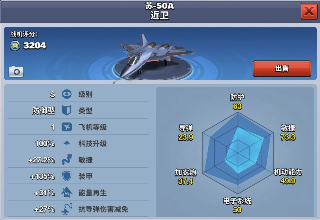 玩家勋章达到1400勋章可解锁该架飞机,需要花费2400钻石获得,也可花费3600钻石提前购买。苏-50A近卫拥有极厚的装甲,机动性灵活,能量恢复速度极快,是数一数二的肉盾,同时也是闯关能力者,属于S级防御型飞机。