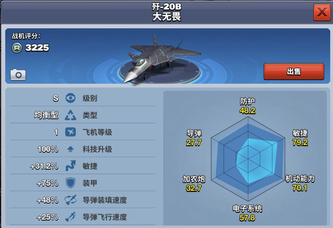 玩家勋章达到1200可解锁此飞机,需要花费3200钻石获得。歼-20B大无畏敏捷性十分灵活,拥有最好的导弹装填速度,是一款导弹飞行速度极快的均衡型飞机,在2V2联机对战中,是佼佼者。