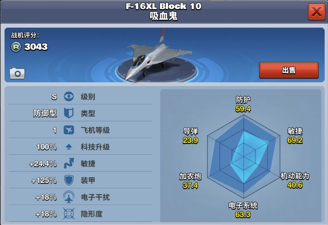 在游戏中是一架S级别的均衡型战机,它拥有47.24的敏捷度、360的装甲值、128.4的速度、1.48的加速度、115的能量值、43.2的导弹攻击力以及3.3的加农炮攻击力。该战机的特性为【超态势感知】:能够将电子干扰效果提升2.18%,同时增强2.18%的闪避能力。