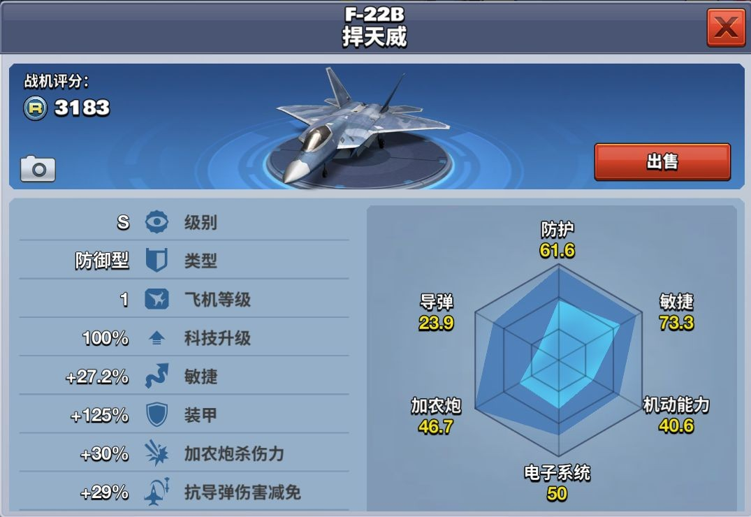 玩家勋章达到1500可解锁此飞机,需要花费4000钻石获得。F-22B捍天威拥有极强加农炮杀伤力属性,抗导弹伤害减免属性位居前列,装甲够厚,是一款机炮流防御型飞机。