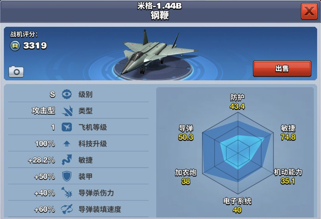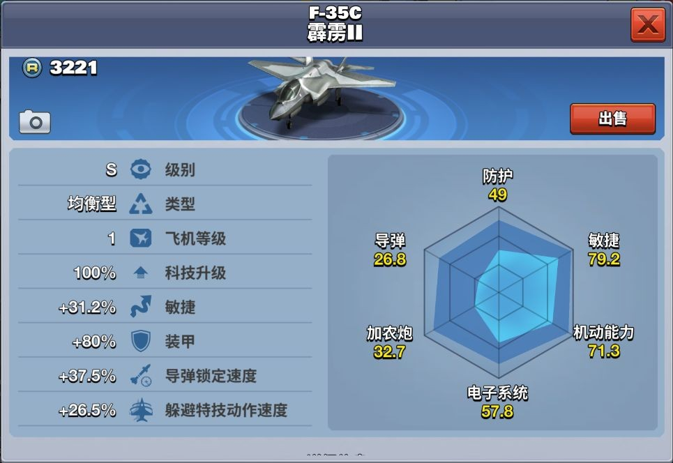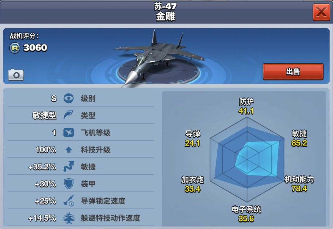 该架飞机16级解锁,需要花费12000金币获得。F-15MTD飞行太保涂装精美,暴击率给力,闪避能力较好,是一款S级防御型飞机。