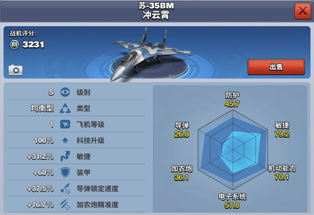 玩家等级达到800勋章即可解锁该架飞机,只需花费320钻石可以获得,也可消耗480钻石提前购买。苏-35A超侧卫能够用最短的时间加速到最大的速度飞行,各方面的属性都适中,是一款S级均衡型飞机。