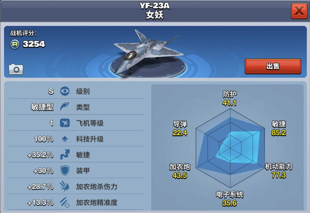 玩家等级达到2000勋章解锁此架飞机,需要花费168000金币获得,可花费5040钻石提前购买。YF-23女妖的加农炮杀伤力和加农炮精准度都不错,是一款S级机炮之王,属于敏捷型飞机。