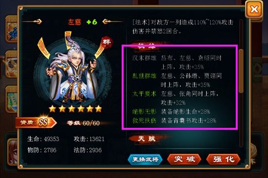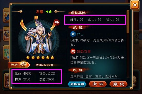 第二步,强化完武将之后,当然要对武将进行突破了。武将突破需要消耗突破丹、银币以及其他的道具。有付出就有收获,武将突破之后的各项属性会获得大幅度提升。