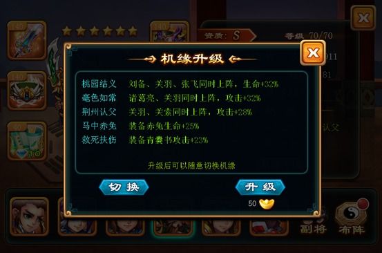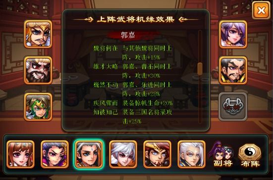不过,实际上能够上场的武将只有5位,因此很难达到完美的机缘搭配。这时,副将系统就派上用场了。当你的等级分别提升到28级、35级、40级、50级、60级和80级时,都会解锁一个新的副将位置。这样一来,你就可以通过安排副将来激活主将们的机缘效果了。值得一提的是,副将并不需要进行强化或突破,这样可以为你节省不少资源。