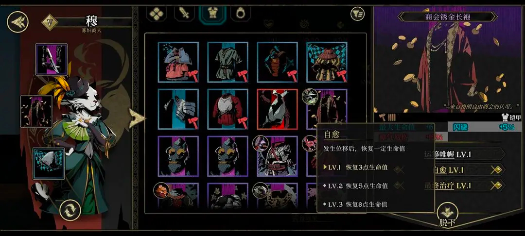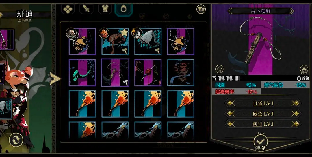装备方面:1.鹿穿闪避装备,武器可以选择输出(词条最好有闪避),衣服可以选择商会长袍等带闪避属性的衣服,饰品可以选择蓝色闪避头盔(禁卫头盔),装备词条的闪避越多越好,五闪避配合闪避装备+野外闪避buff的情况下最高开局可以达到开局60多的闪避。其他词条推荐:困首(三困兽才能用),暴击,分金(暴击-防),我为先锋(初始回合+高额抵御),自愈(换位+血),剑舞(技能有位移+暴击)等