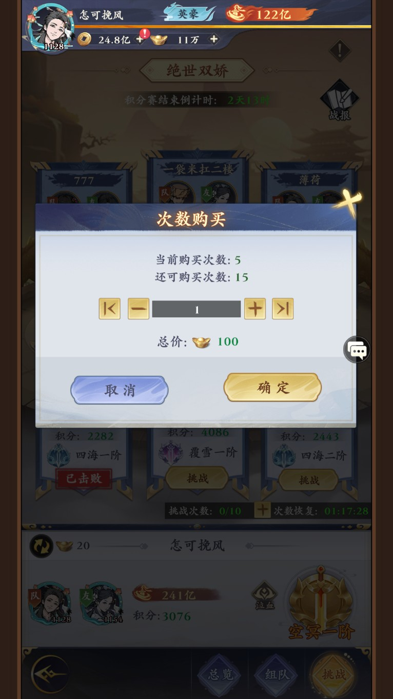 三、珍珑棋局,需要消耗喝酒,一年烧酒1分,三年花雕酒10分,五年竹叶青20分,十年女儿红50分,百年不参与积分,第一轮1400分,后面四轮每轮1900分,这个基本都可以完成五轮积分,每日888元宝可购买两次棋子加上每日挑战,绝大多数零氪玩家都可以到达60,需要更多层的奖励可以购买68的天官赐福加18的每日,这个奖励优先招募券,经脉丹,精研,60层神兽可优先选择青龙或者玄武,后续还会有200侠客,阵法,招式可按照自己的需求选择