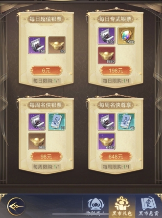 黑市礼包需充值购买,有条件的建议购买每日6元银票,还是挺超值的。