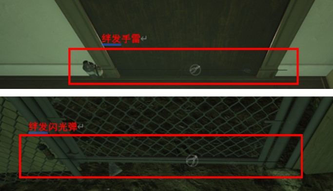 绊发爆炸物(以下简称绊雷)分为绊发手雷和绊发闪光弹2种,其安装方式也有门前和门后两种。绊雷较为明显的标志是爆炸体,但有些绊雷的爆炸体较为隐蔽或穿模,不易被发现,因此判断绊雷还应以门下绊线为准。