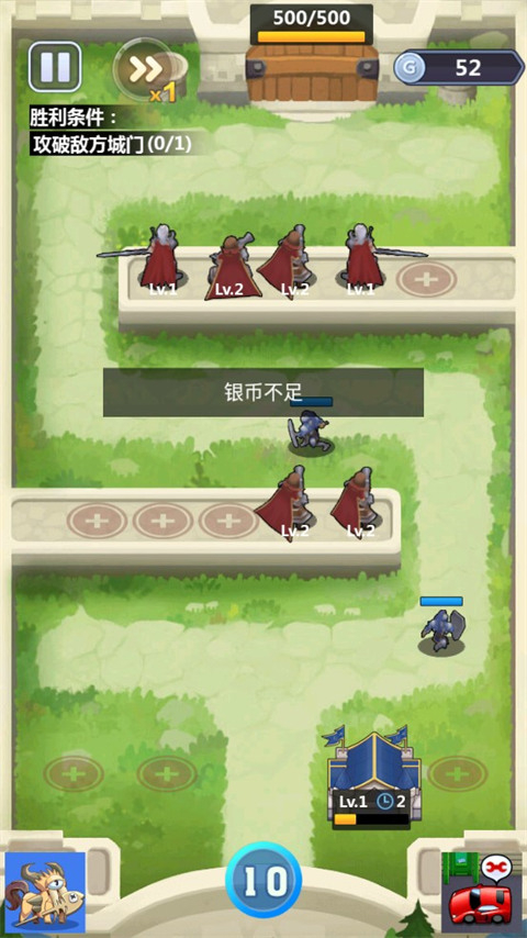 挑选您想要挑战的关卡,如下图所示,这就是塔防游戏的战斗界面。在游戏中,敌人会源源不断地从上方的城门涌出,并向我方基地发起攻击。