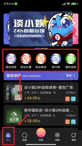 4. 返回首页,点击“附近球房”或“附近比赛”,就可以查看周围的可用场地和赛事信息了。