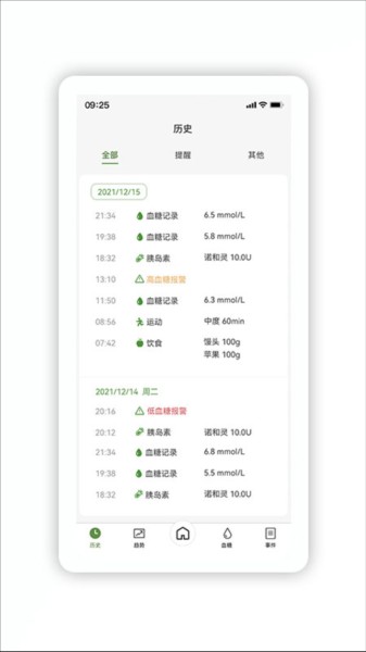 对血糖历史数据进行了记录和管理,用户可以在历史中心查看以往的血糖数据。