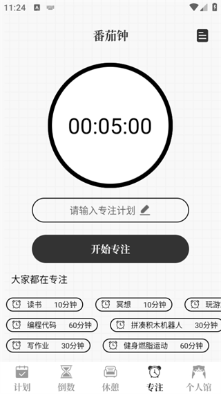 7、专注板块是自律专用的功能,为用户提供一个良好的工作环境或学习环境;