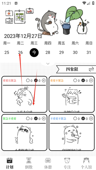 4、在计划中,我们可以通过点击顶部的时间区域来添加计划清单,只需点击四象限中任一板块的右上角即可完成添加;