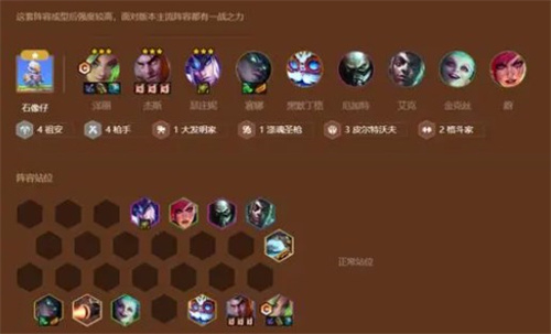 阵容核心是围绕3皮城2枪手2格斗2祖安搭建阵容,核心打工仔是金克丝+基克的先驱。优先推荐开局有3皮城开始养龙玩这套阵容。