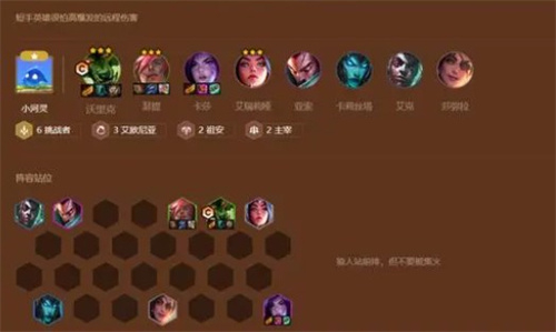 (1)由6个单位组成的阵容包括狼人、瑟提、莎弥拉、艾瑞莉娅、艾克和卡莉斯塔,形成了4挑战者和2祖安的羁绊。
