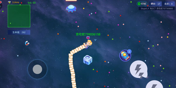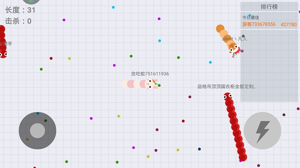 3.控制摇杆走位你的小蛇,不断吃掉小光点,成为世界最长蛇蛇!