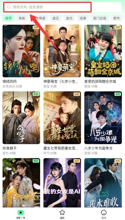 3、返回首页后,轻点顶部搜索栏,输入剧名关键词即可查找想观看的短剧内容。