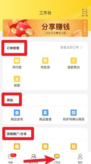 3、点击下方的“工作台”按钮,在这个页面上,您可以执行订单管理、商品发布、商品同步以及营销推广等功能。