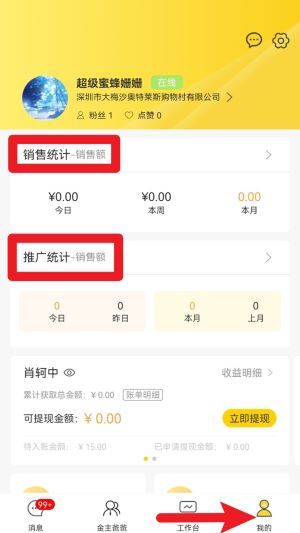 4、在“我的”页面中,您可以查看销售统计和推广统计数据,便于随时了解业务进展和收益状况。