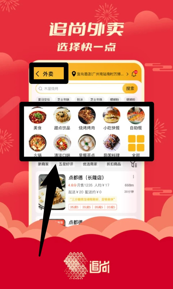 2. 点击“外卖”板块,挑选美食、甜点、烧烤等分类,选择喜欢的商家下单配送。