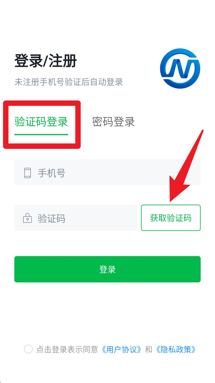 1. 启动App并进入登录页面,可以选择“验证码登录”或“密码登录”方式,输入手机号码后完成登录过程。