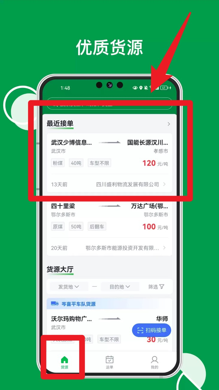 2. 登录成功后,进入首页的“货源”部分,您可以浏览最新的接单信息、货源大厅以及历史记录。