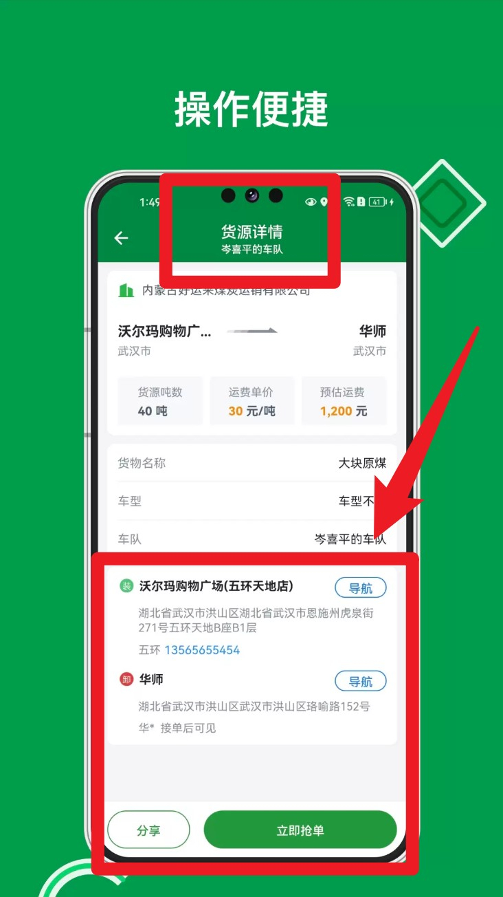 3. 点击任意货源以进入“货源详情”页面,在这里您可以查看出发地、运费、货物重量、所需车型等信息。确认无误后,即可进行抢单。