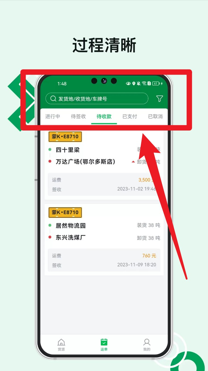 4. 进入“运单”页面查看物流状态,系统会自动将其归类到“进行中”、“待签收”、“待收款”等不同状态栏中。